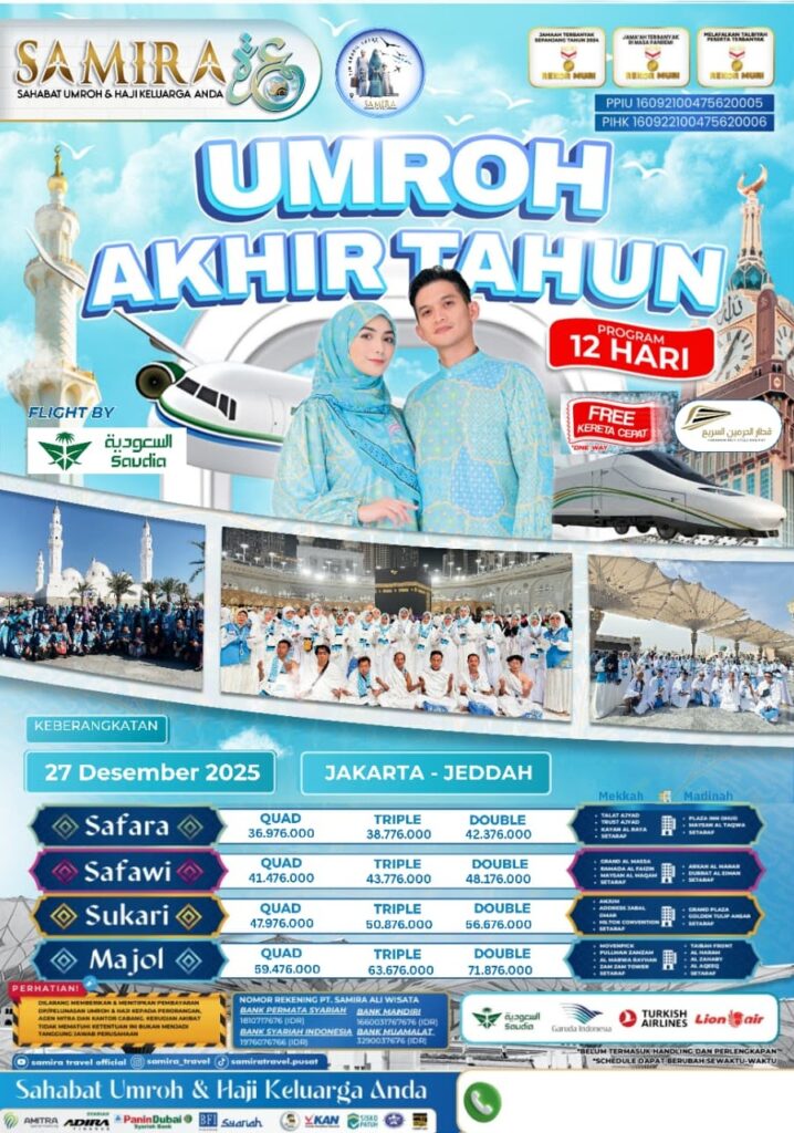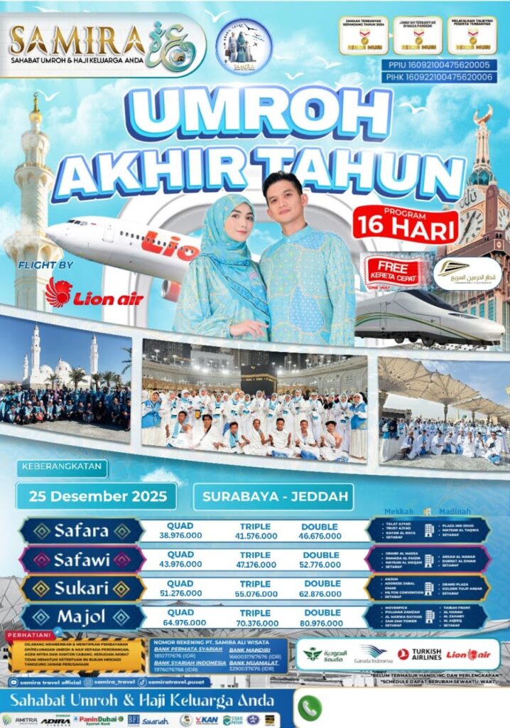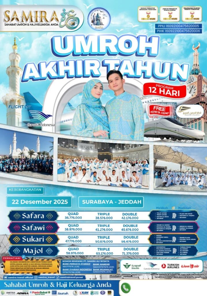 Samira Travel Sidoarjo terdaftar resmi di Kementerian Agama, telah memberangkatkan ribuan jamaah, dan mendapatkan banyak testimoni positif dari jamaah. Kepercayaan yang kami dapat kami bangun dari transparansi biaya, kejelasan jadwal, dan komitmen dalam menjaga kenyamanan dan keamanan jamaah.