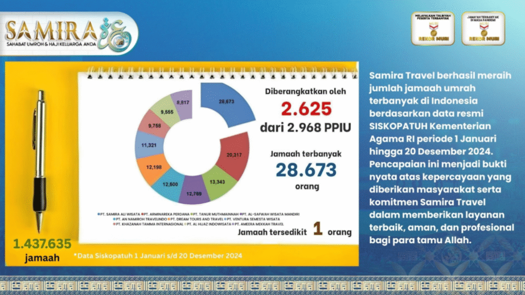 Sejak 2021 sampai Mei 2025 alhamdulillah samira travel menjadi travel dengan jamaah terbanyak di Indonesia. Pencapaian ini menandakan samira travel adalah travel umroh yang amanah dan bisa dipercaya untuk mewujudkan impian anda menjalankan ibadah umroh yang mabrur. Selama 2024 Samira Travel tercatat memberangkatkan 28.673 Jamaah.